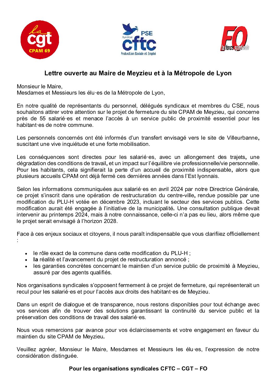 Les employés de la CPAM de Meyzieu à travers une lettre ouverte, essaient d’interpeller les élu(e)s de Meyzieu ainsi que ceux de la Métropole. Lettre ouverte.